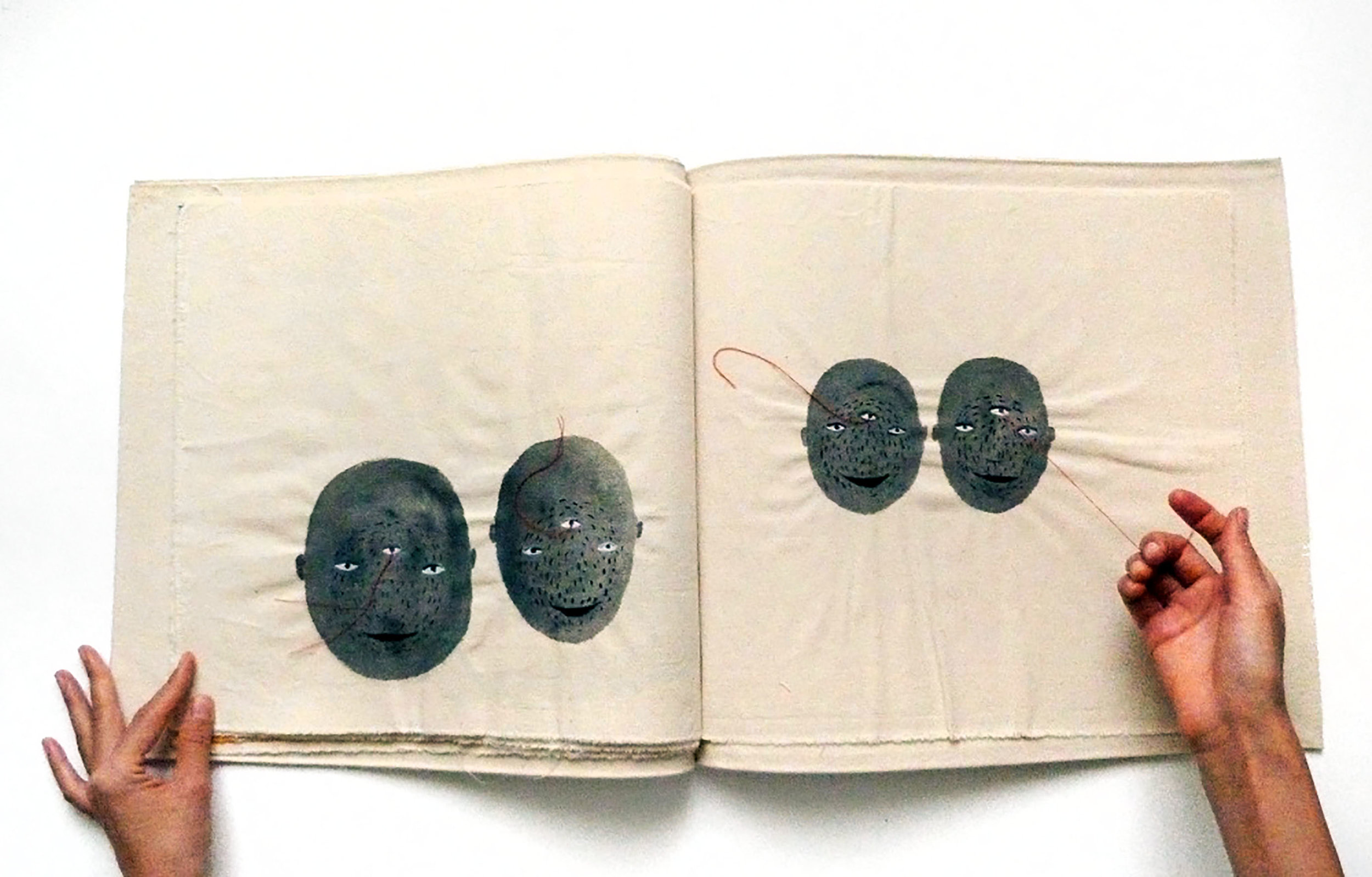 Drawing book, watercolour on canvas, red thread, 9 pages, 19.6 x 25.6 in.